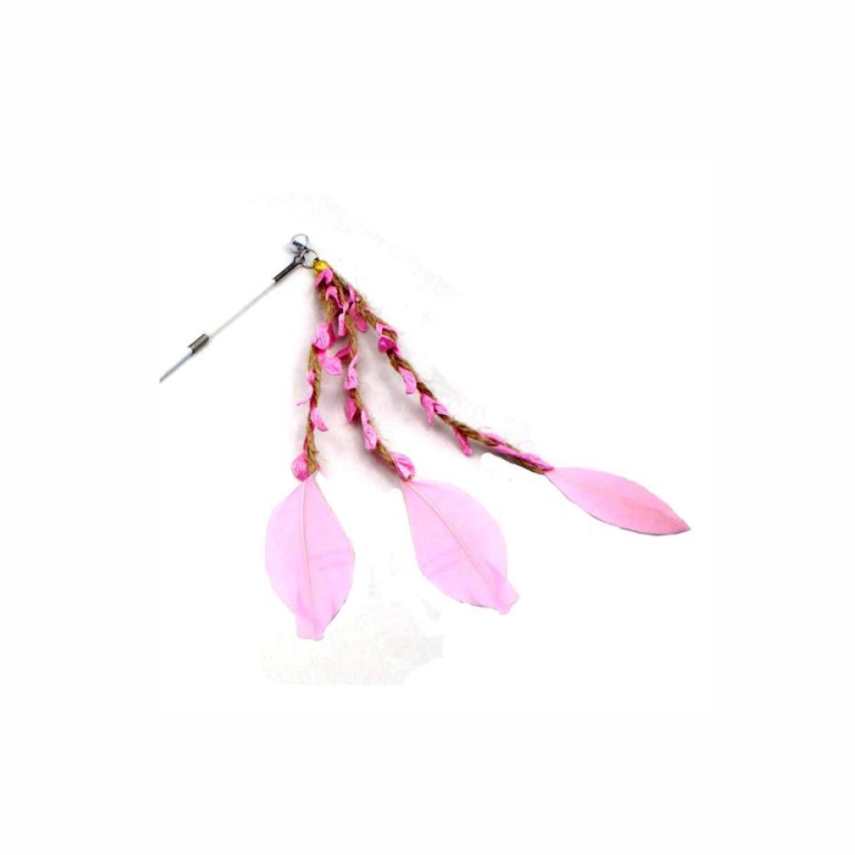 The stick features 3 pink sisal ropes with toy leaves and feathers attached that will flutter like birds as you wave it around.
