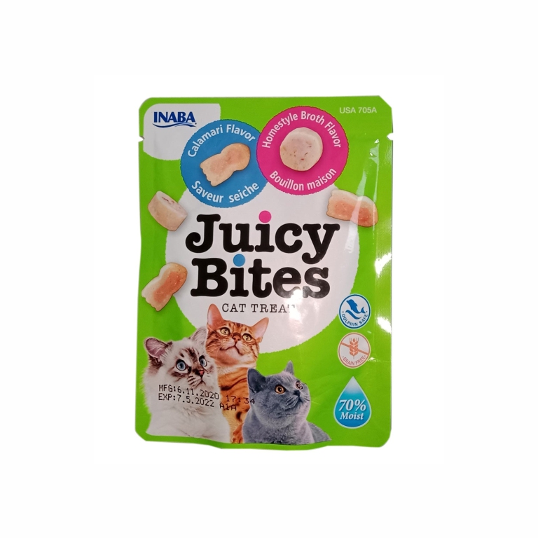 MADE WITH WHOLESOME INGREDIENTS YOU CAN TRUST: Every Inaba product is made with yummy high’quality ingredients, including farm’raised chicken and/or natural wild’caught tuna HEALTHY CAT SNACKS: These flavorful, moist treats for cats contain 71% moisture and only 15 calories per pack’ that’s almost 50% fewer calories than a serving of traditional dry treats, so you can feel good about feeding these to your kitty YUMMY AND FREE FROM BAD STUFF: We’ve kept out the bad stuff like grains, preservatives, artificial colors, and carrageenan. But we’ve added Vitamin E for your cat’s immune system and Green Tea Extract as an antioxidant HAVE THEM EATING OUT OF YOUR HAND: These tender, bite’sized treats can be fed by hand to promote interaction with your kitty. You can smoosh a pill into one of the bites to help disguise medications or use it for clicker training FUN SHAPES AND FLAVORS: Available in three fun’shaped flavor duos that have been individually packed in 0.5 servings to help lock in the juice. You’ll be able to find a flavor that cats of all stages (kitten to senior) will crave Feeding Instruction: Feed as a treat to your cat. This product is not intended to be fed as a meal. Provide clean, fresh water daily. For your pet’s health, see your veterinarian regularly. Storage Instructions: Refrigerate after opening and serve as soon as possible.