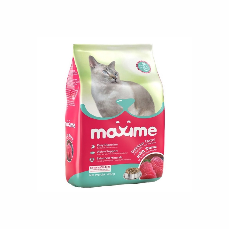 Maxime Cat Kitten & Adult ‘ Tuna 400g Delicious Taste ‘ delicious recipe made with real tuna to delight your cat meal after meal. Easy Digestion ‘ formulated with highly digestible ingredients for an easy digestion. Vision Support ‘ enriched with taurin. Taurin is required for healthy function of the eyes. Balanced Minerals ‘ Salance in sodium and other minerals to take care of your cat or kitten every day. Complete food for all breeds of kitten and adult cat.
