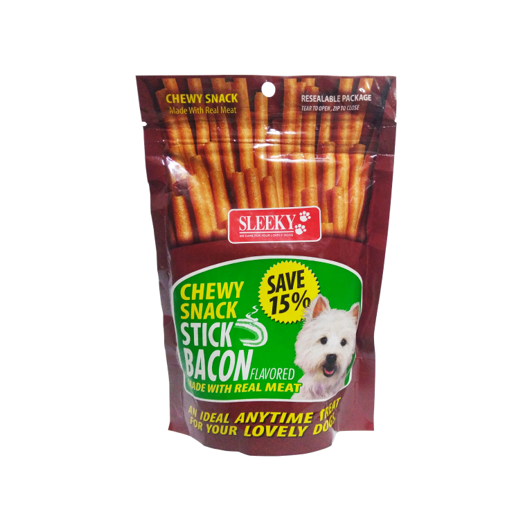 Sleeky Chewy Snack Stick Dog Treats An ideal anytime treat for your lovely dogs Made with real meat Great Tasting Bacon Flavor For all breeds and all life stages Give at will to show affection to dogs or as a reward treat Store in a cool and dry place.