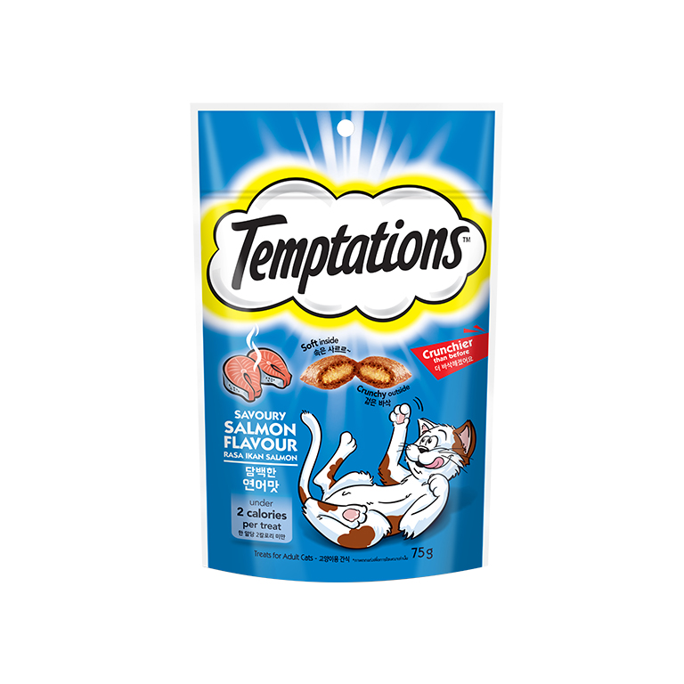 Temptations cat treat provide cats with 100% complete and balanced nutrition Cat treat which is crunchy on the outside and soft and creamy on the inside Contains under 2 calorie per treat and no artificial flavours Comes with the goodness of protein, vitamins and minerals to take care of your fur ball Unique pocket shape treat for cats with Salmon flavour that your cat will love Come in a stay’fresh pack to keep your cat treats fresh Meets the nutritional levels as established by the Association of American Feed Control Officials (AAFCO) Nutrition Profile for adult cat maintenance