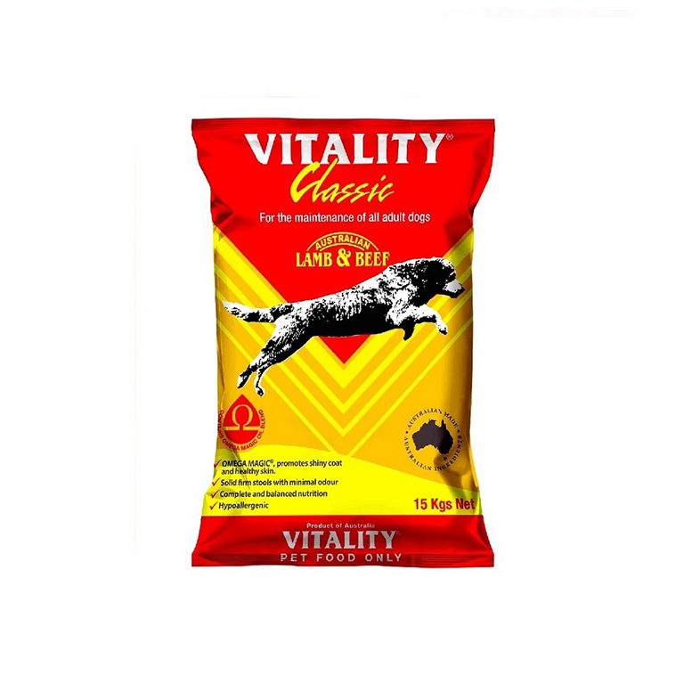 VITALITY Classic Dog Food is the product of thorough research and development by a team of leading nutritionists and veterinarians. Power Up your dog with the energy they need, strong muscles, quick reflexes, clear vision plus increased stamina. Vitality is specially formulated to give your dog the best nutrition for all adult dogs and to help them stay at the peak of condition.’ Super’premium dog food for adult dogs in a satisfying lamb and beef flavor’ Vitality is hypoallergenic. It uses only Australian lamb and beef as the main sources of protein. It does not use any meat from poultry products that may cause allergies to some dogs.’ Vitality uses Omega’3 and Omega’6 to give dogs a superior coat shine and healthy skin. This Omega Magic Oil Blend brings out their vibrant glow.’ Vitality makes a dog?s stool firm and with minimal odor. It does not contain any by’products for a healthier excretion.’ Maintenance for Adult dogs’ Weight: 15 Kilogram