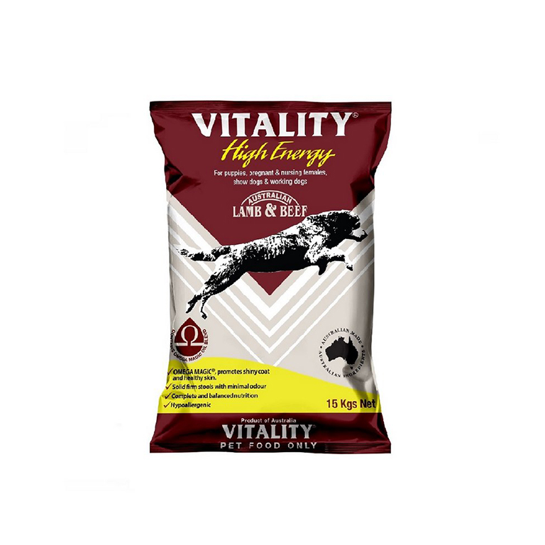 Vitality High Energy is specially formulated to give growing and active dogs the best nutrition and the higher energy they need to maintain their active lifestyle. Power’up your puppy or active dog with the increased energy they need for growing strong muscles, quick reflexes, clear vision plus increased stamina.’ Vitality is hypoallergenic. It uses only Australian lamb and beef as main sources of protein. It does not use any meat from poultry products that may cause allergies to some dogs.’ Vitality uses Omega’3 and Omega’6 to give dogs superior coat shine and healthy skin. This Omega Magic Oil Blend brings out their vibrant glow.’ Vitality makes a dog?s stool firm and with minimal odour. It does not contain any by’product for a healthier excretion.’ For puppies’ For pregnant and nursing females’ For show dogs and working dogs’ Weight: 15 Kilogram