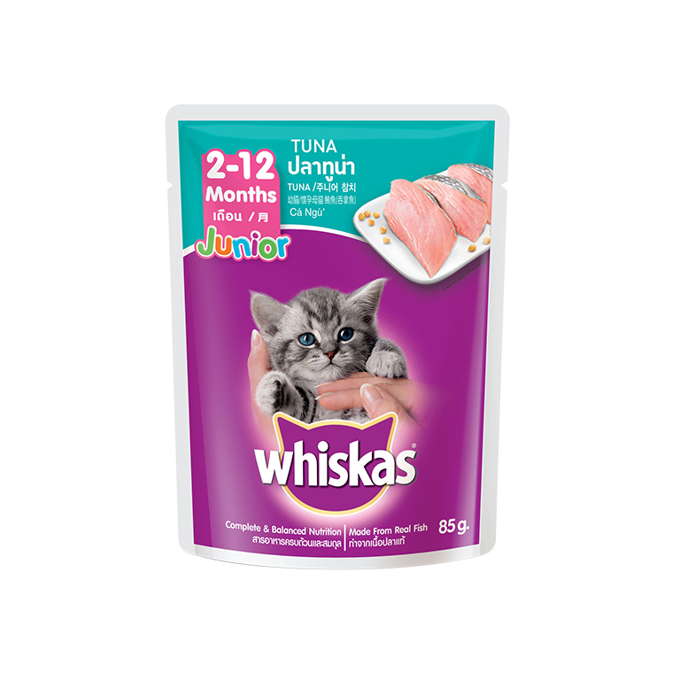 Whiskas Junior Wet Cat Food Available Flavours: Tuna, Mackerel Junior (Kitten), 2’12 months Complete Nutrition, Healthy Bone and Body Grow Contains Antioxidant, Lively and Energetic Healthy Coat, Healthy Eyesight Whiskas Junior is a nutritionally complete and balanced recipe that has carefully been created to cater to the requirements of an adult cat?s system. Whiskas Junior is formulated to meet the nutritional levels established by the AAFCO Cat Food Nutrient Profiles for adult maintenance